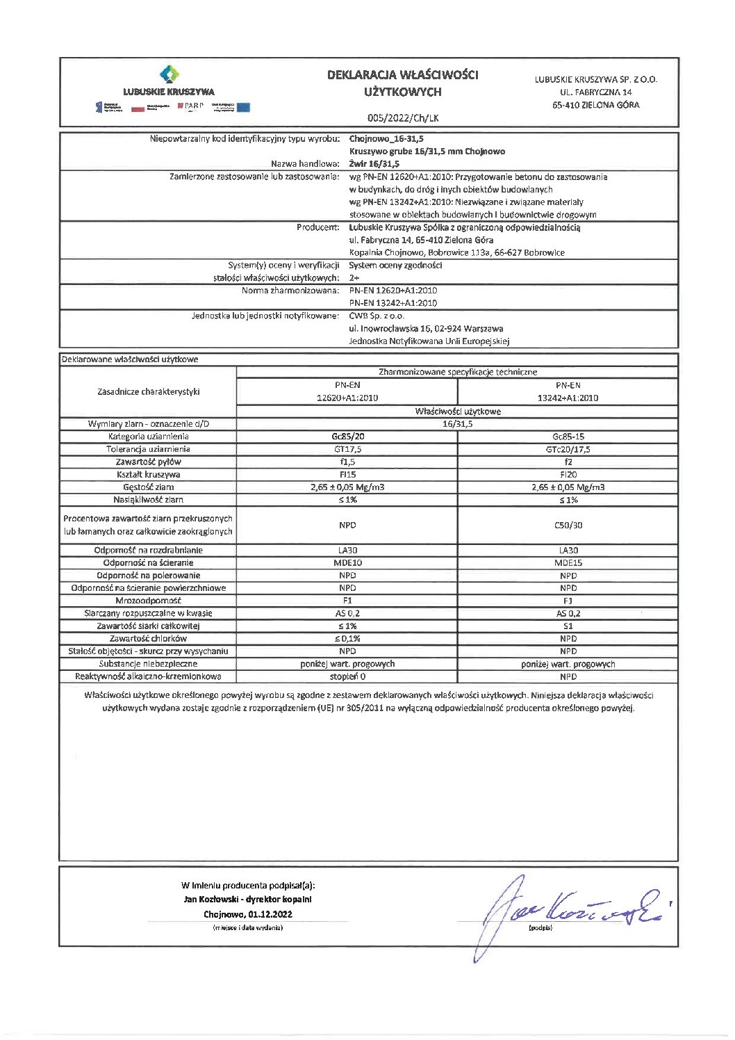 PN-EN 13242, PN-EN 13043, PN-EN 12620.